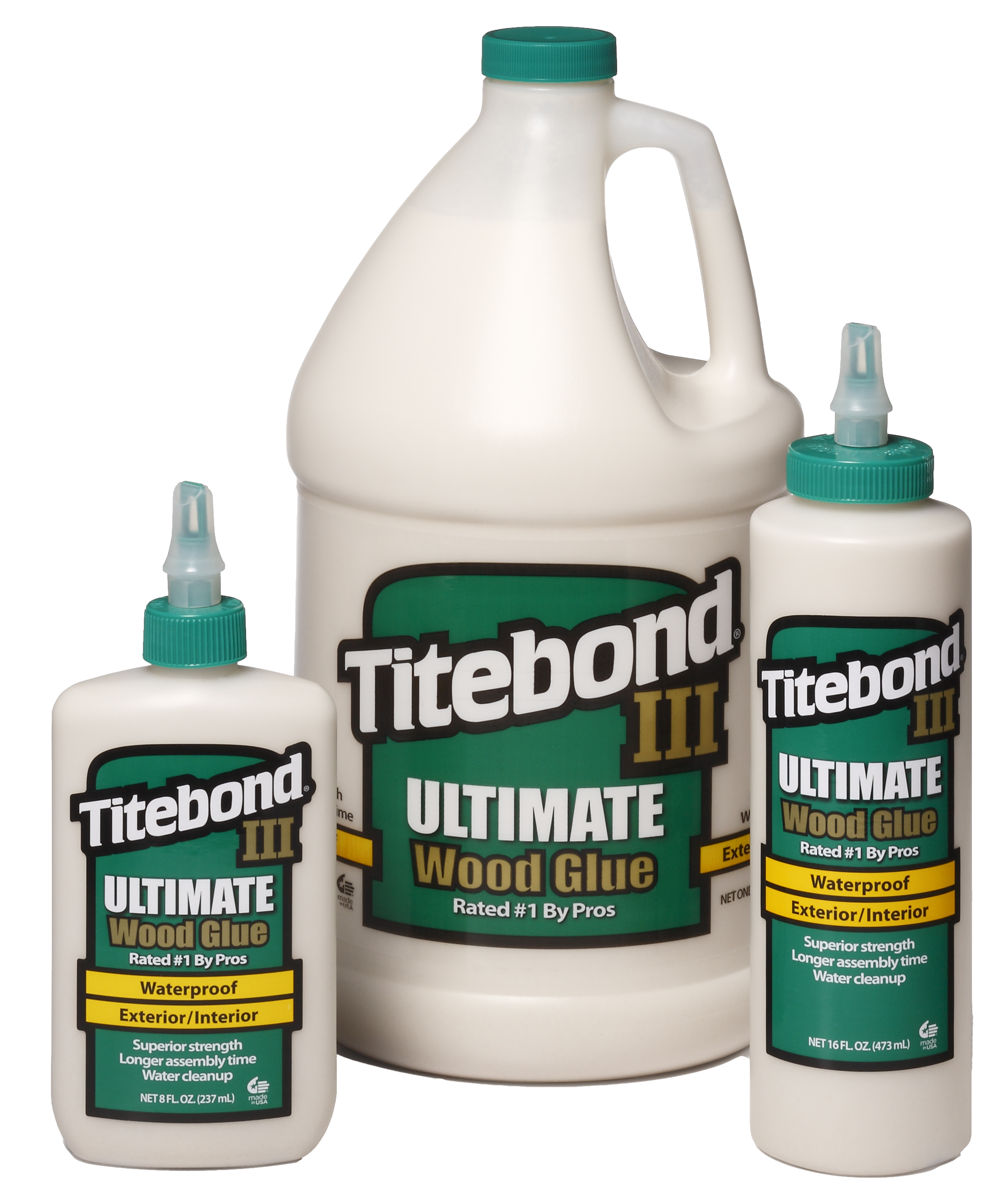 Titebond III Ultimate Wood Glue is the first one-part, water cleanup wood glue ever offered that is proven waterproof. The waterproof formula passes the ANSI/HPVA Type I water-resistance specification and offers superior bond strength, longer open assembly time and lower application temperature. Titebond III is non-toxic, solvent free and cleans up with water – safer to use than traditional waterproof wood glues. It provides strong initial tack, sands easily without softening and is FDA approved for indirect food contact (cutting boards). The ultimate in wood glues – ideal for both interior and exterior applications.
