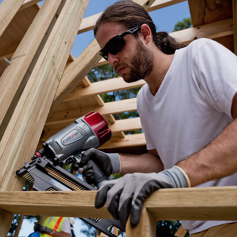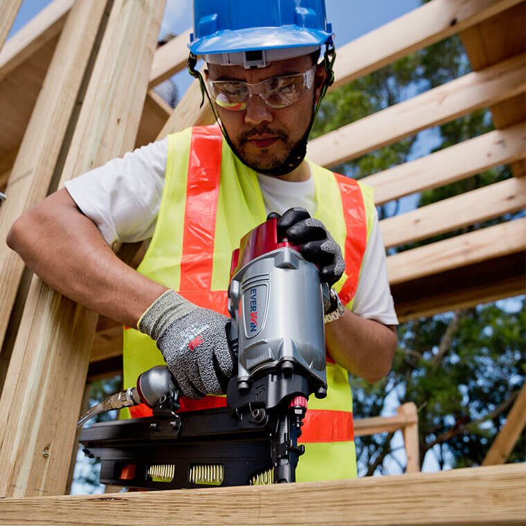 Adjustable depth-of-drive pneumatic framing nailer. Drives up to 3 1/2″ nails.