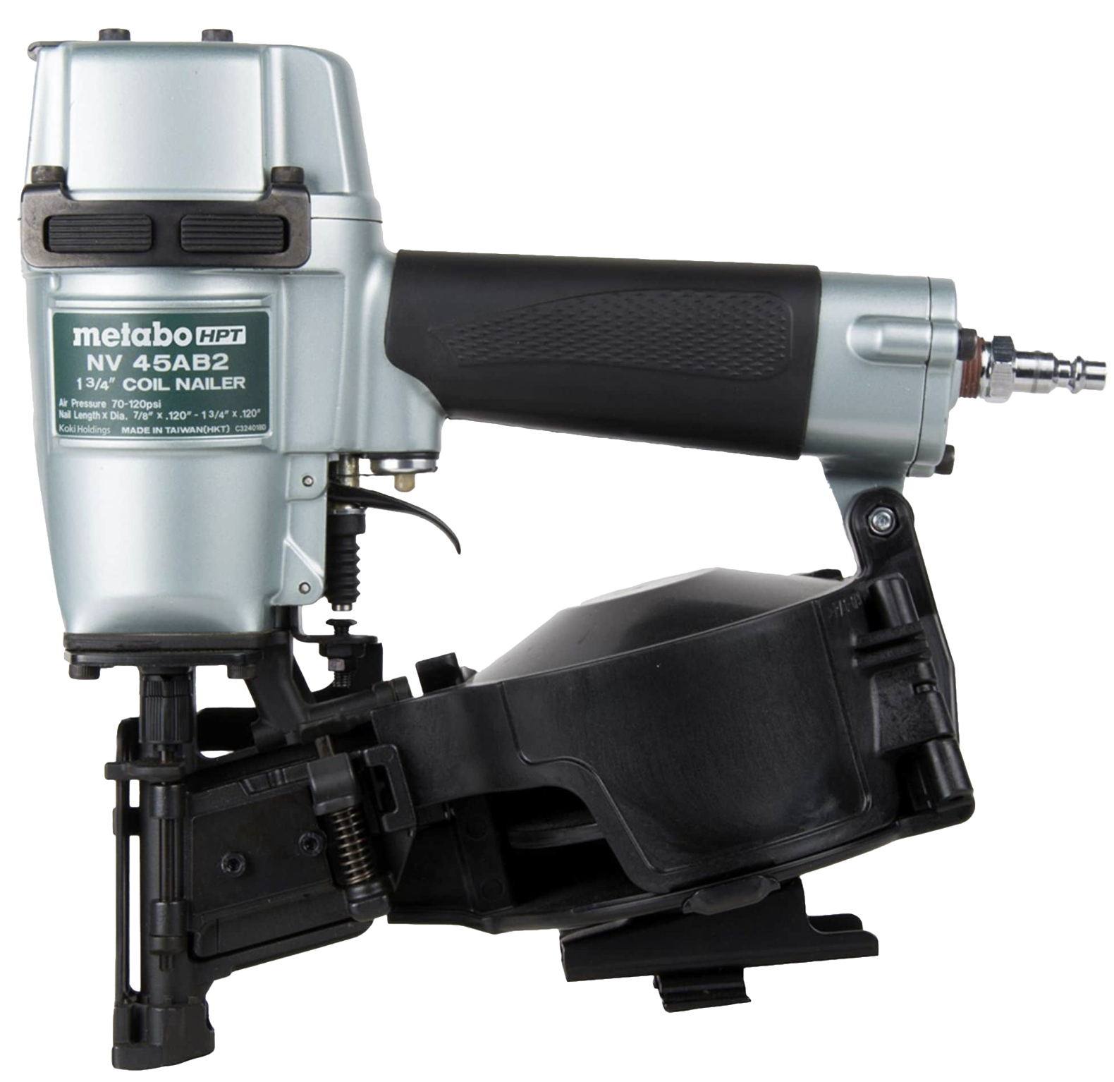 The Metabo HPT Coil Roofing Nailer (NV45AB2), it is extremely lightweight, (only 5.5 Lb.) making it the essential tool for the fast-pace working environment. It features rapid driving and unprecedented quick response with unique cylinder valve firing mechanism allowing you to fire up to 3 Nails per second. The Coil Roofing Nailer will fire all standard Roofing Nails ranging in size from 7/8 In. to 1-3/4 In. Its depth of drive adjustment will allow the user to drive the nail to the desired depth at operating pressure ranging from 70 to 120 psi.