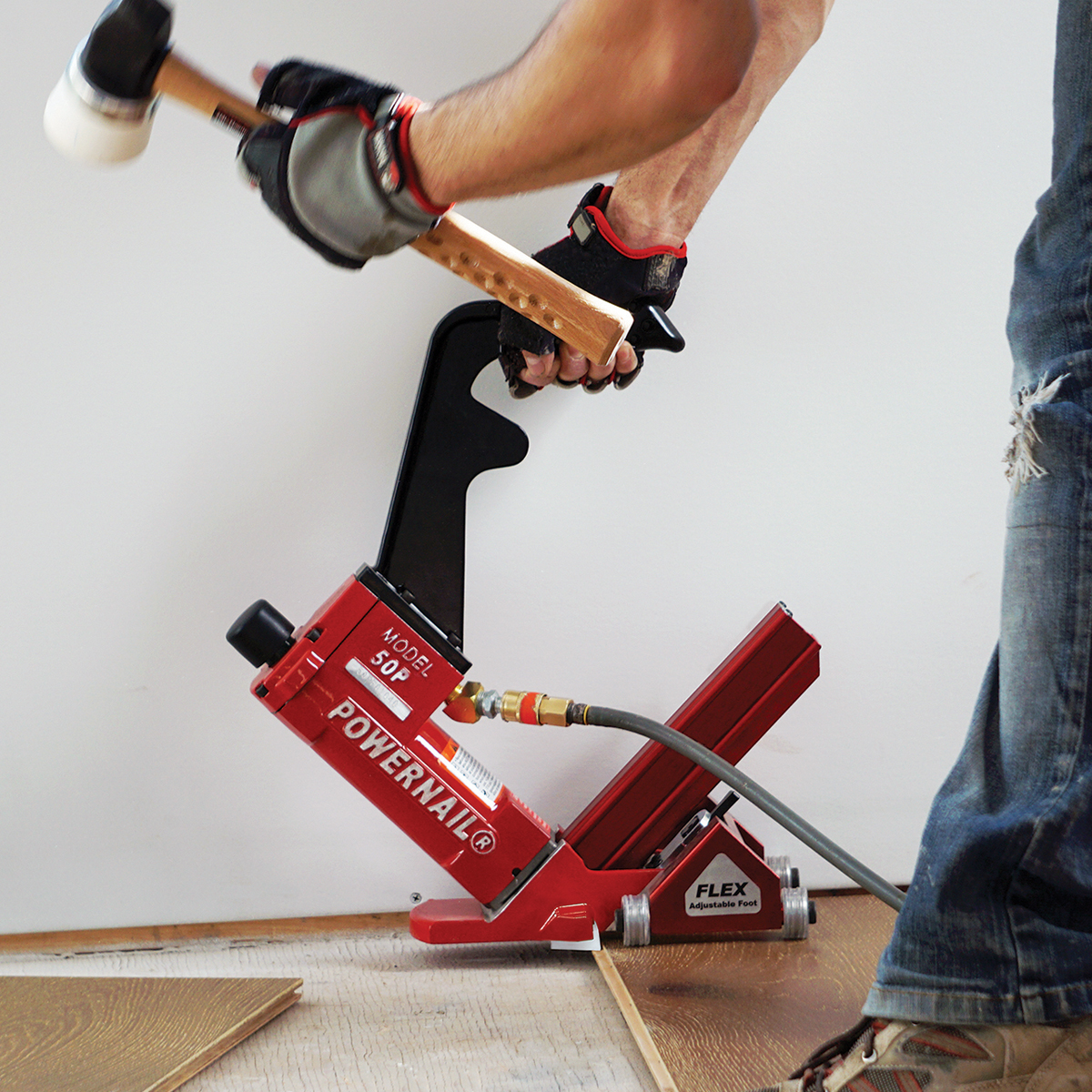 When comfort and control are a priority, you can depend on the Powernail Model 50P Power Roller. Outfitted with the new Tri-Glide Power Roller, this cleat nailer now delivers speed, comfort and accuracy while protecting delicate edges and finishes. The FLEX Power Roller foot adjusts from 3/4″ to 3/8″ and is suitable for domestic and exotic hardwoods. 50P Series nailers use a thinner 18 Gauge cleat that is less likely to split the tongue on thinner woods. It is also recommended for flooring that is a very hard species like hickory. Many of the hard exotics available today require a thinner cleat to penetrate without splitting the tongue. Handles 18GA cleats with either 1-1/4″, 1-1/2″ or 1-3/4″ length.